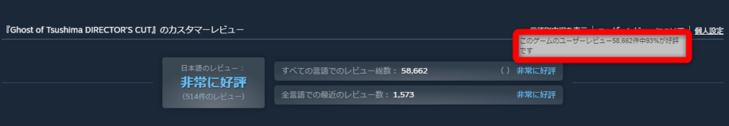 円グラフは以下steamにおける2026/3月時点の『ゴーストオブツシマ(Ghost of Tsushima)』の評価レビューを元に作成。